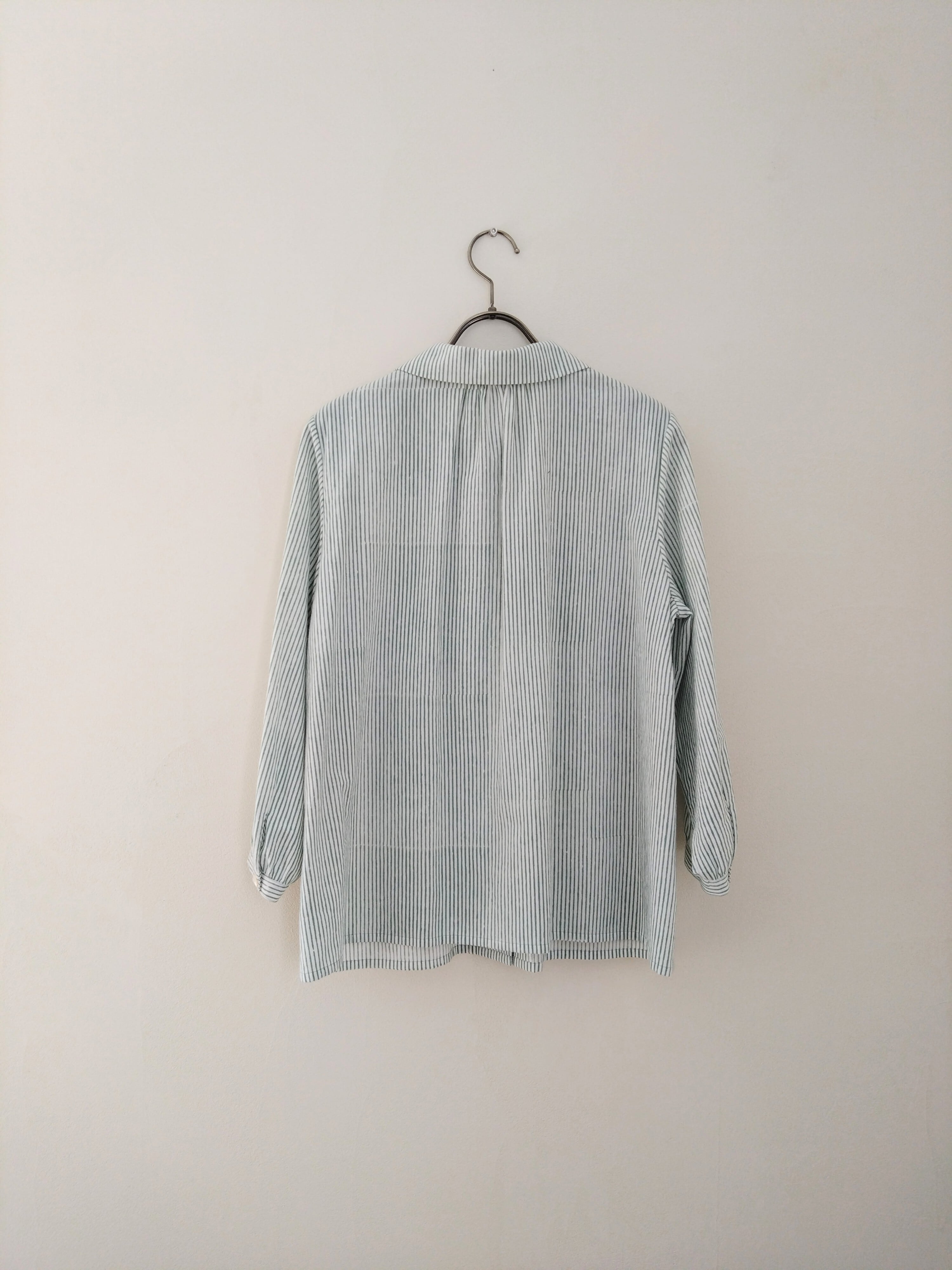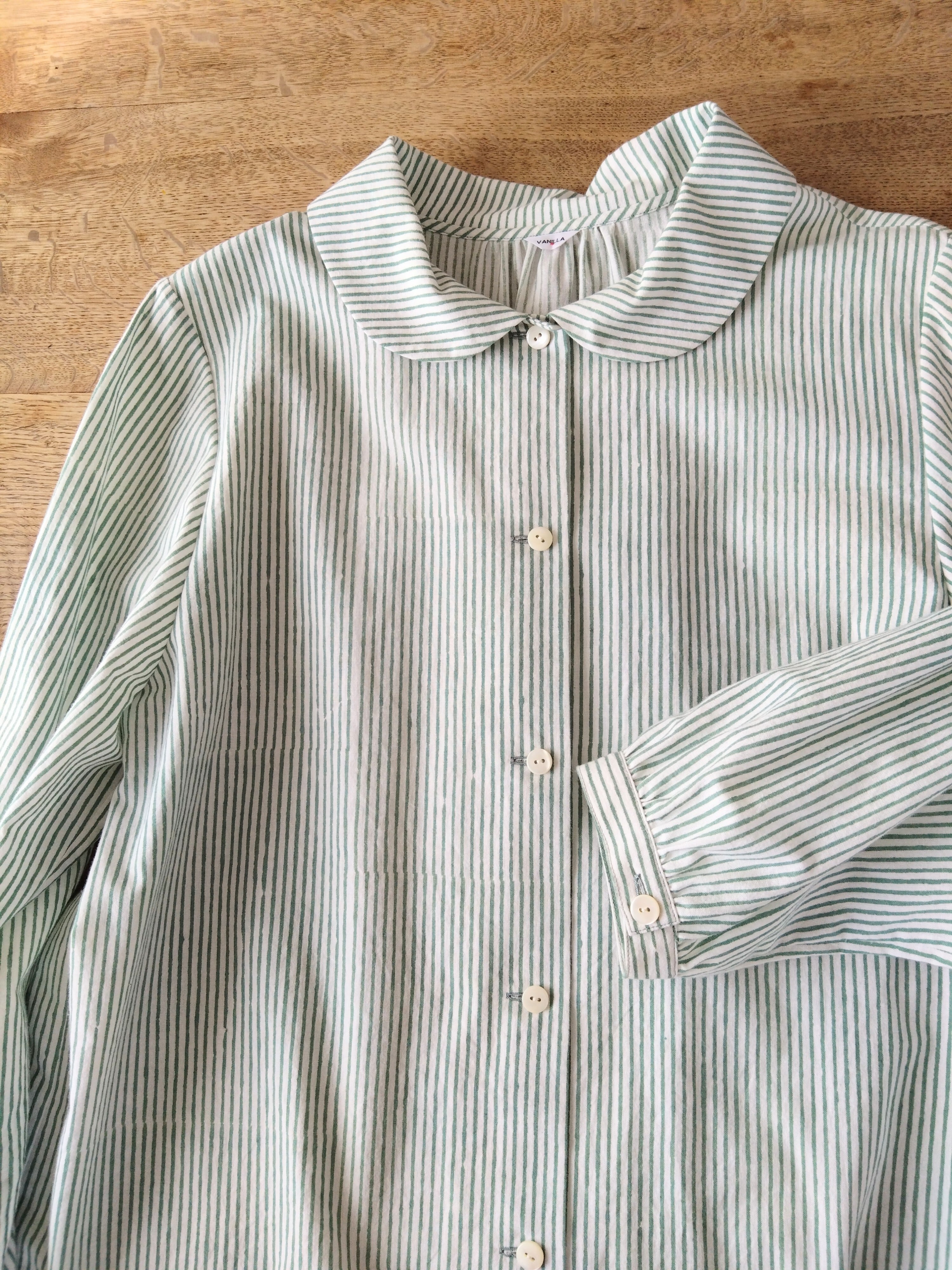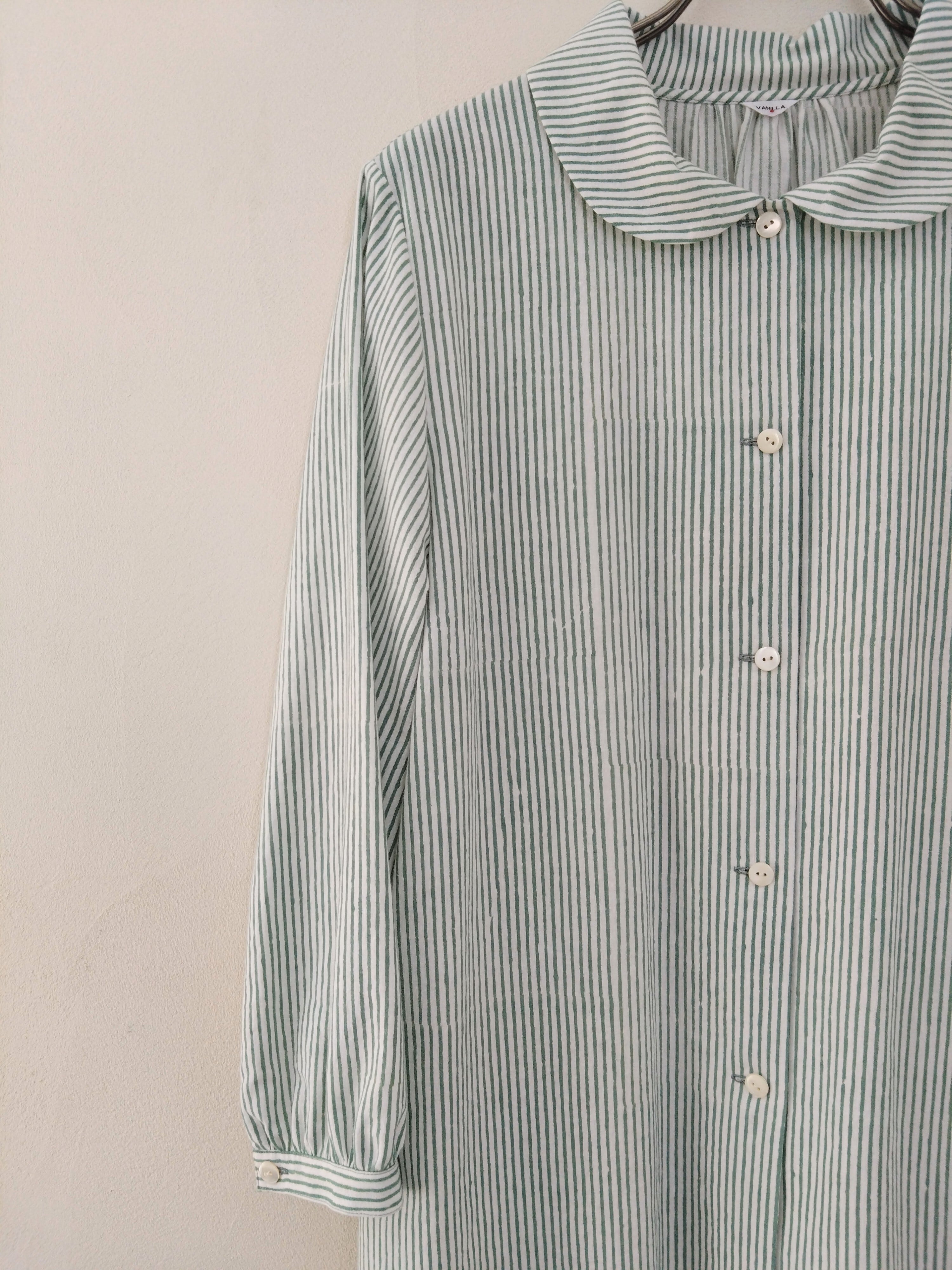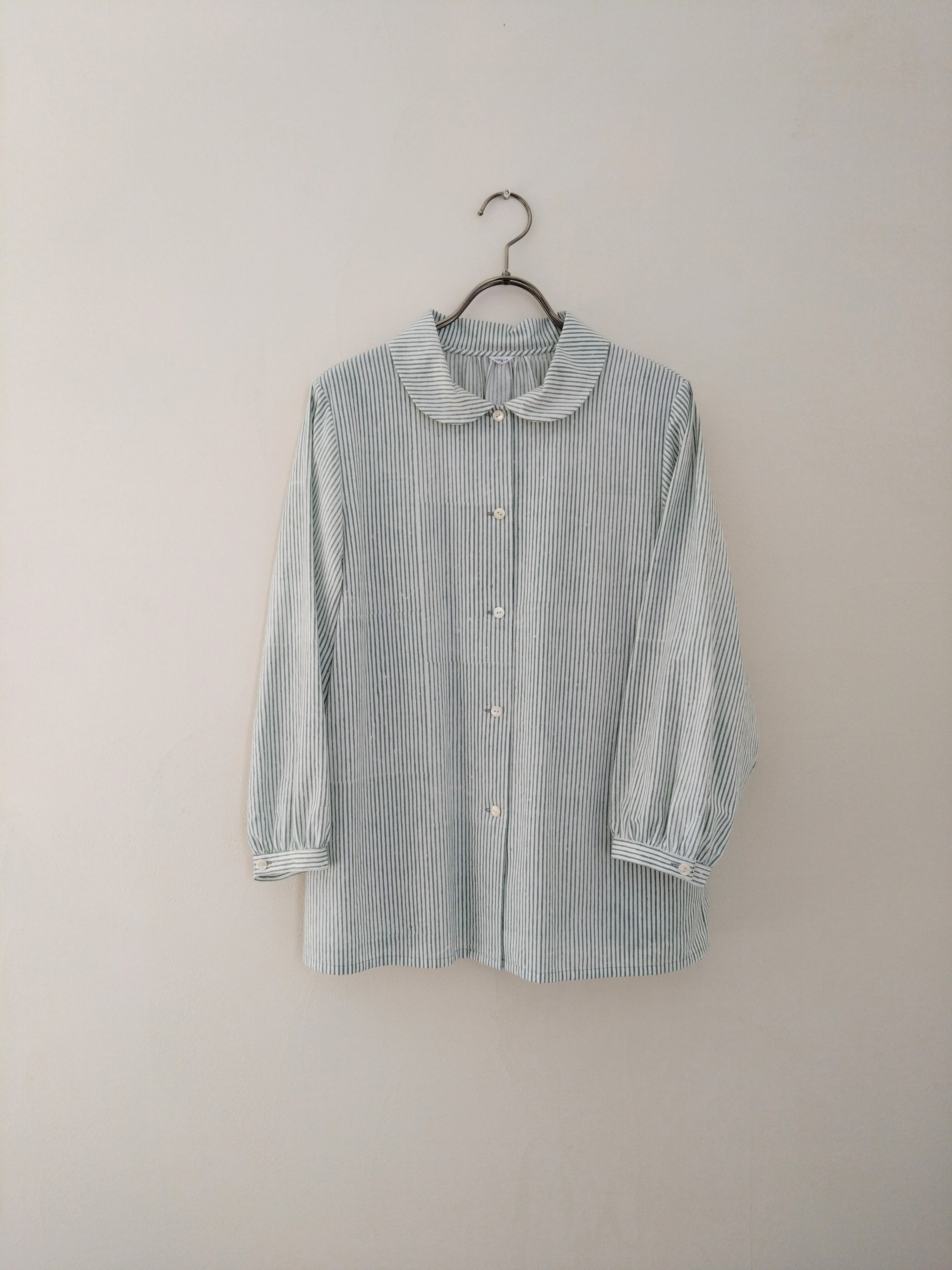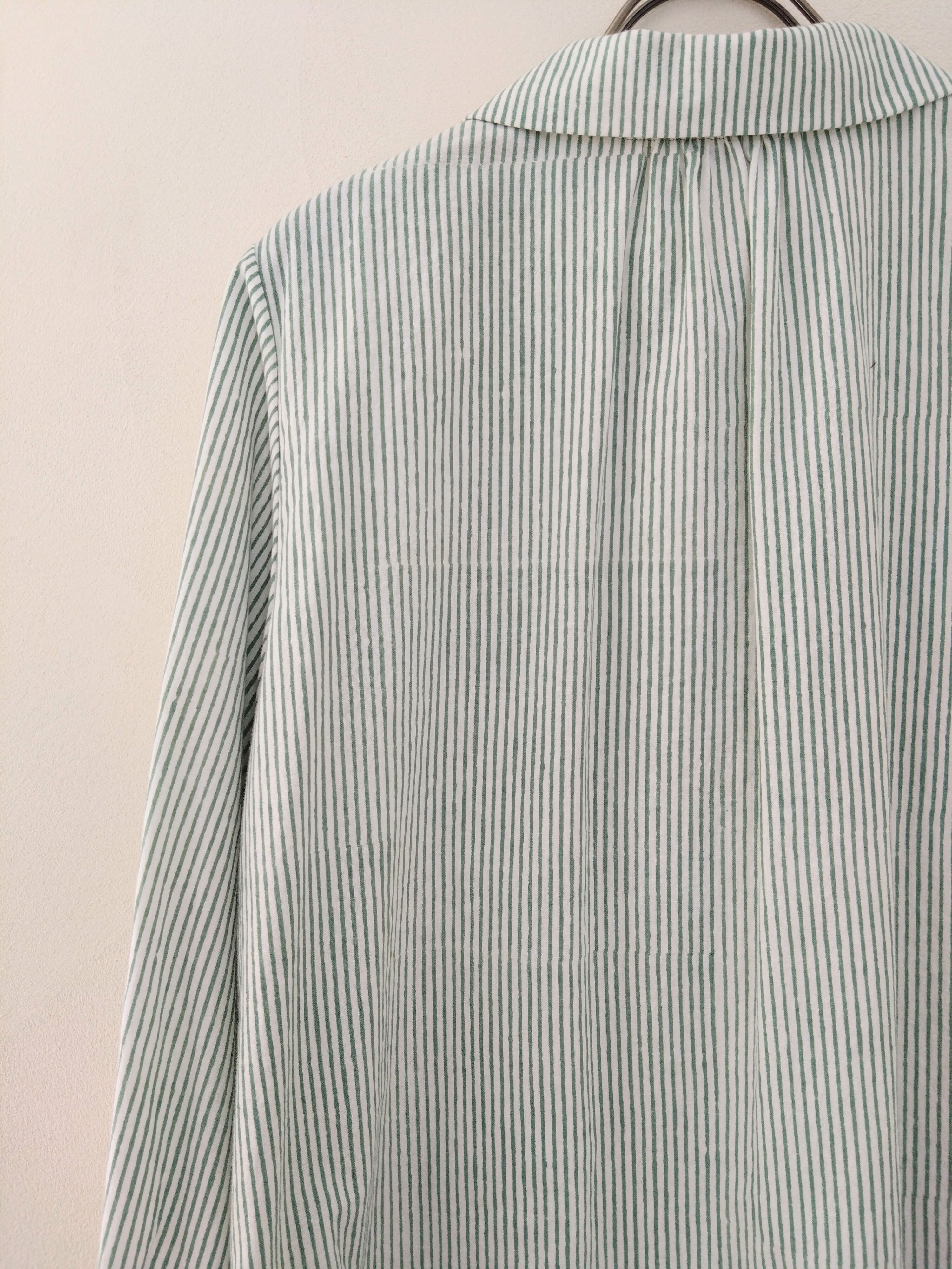 丸襟ブラウス コットン木版プリント グリーンストライプ Lサイズ